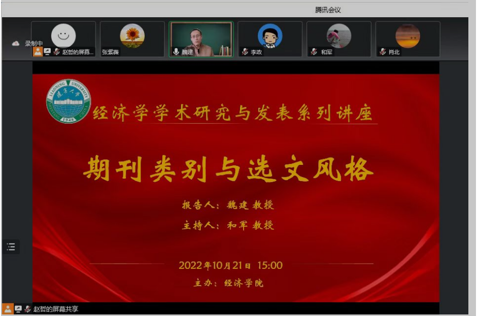 为提高青年教师学术研究与成果发表水平,英国正版365推出“学术研究与发表”系列讲座。2022年10月21日,辽宁大学经济学院“学术研究与发表”系列讲座第一期成功举办。此次讲座邀请到山东大学二级教授、教育部新世纪优秀人才、国务院特殊津贴获得者、人文社科期刊社社长兼《山东大学学报(哲学社会科学版)》主编魏建做了题为“期刊类别与选文风格”的报告。讲座由英国正版365副院长和军教授主持,李政院长及70余名教师与研究生线上参加了报告会。