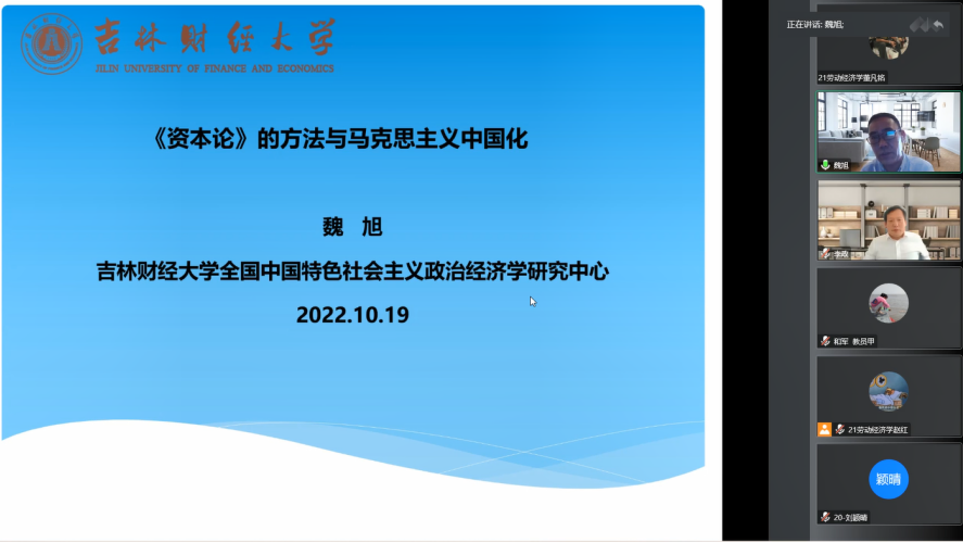 10月19日下午,英国正版365“经济学前沿系列学术讲座”第9期成功举办。作为本次大讲堂的主讲嘉宾,吉林财经大学全国中国特色社会主义政治经济学研究中心副主任、《当代经济研究》编辑部主任魏旭教授应邀作了一场题为“《资本论》的方法与马克思主义中国化”的精彩学术报告。英国正版3652020级和2021级全体博士生及其他校内外师生代表120余人线上参加了报告会。本次大讲堂由英国正版365院长李政教授主持。