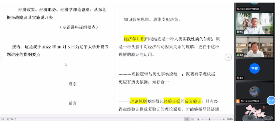 袁东教授开篇从他应邀开设本次讲座的指导思想——三个初步认识讲起,即:知识影响思维,思维支配决策;经济学知识归根结底是一种人类实践性质的知识;要将观察视角置于“发展过程的关键时刻”。遵循这一指导思想,袁东教授循循善诱地就东北振兴战略确立和实施进程中反映出的问题及其原因进行了分析。从东北的产业结构和1980年代中期开始的一系列国家宏观经济政策转型及其对东北重工业的影响两个方面,回答了为什么会有东北振兴战略确立这个值得深思的问题。通过观察东北地区经济增长率(GDP)、固定资产投资增长率和第二产业所占比重这三个指标自2003年以来的变化及其与全国平均水平的对比,袁东教授详细分析了东北振兴战略实施进程中所反映出来的问题,并由此得出结论认为:东北振兴的关键在于工业与农业尤其是工业;东北工业的振兴特别是国有工业的振兴,关键在于基础广泛的产业升级;以重工业为主体的东北工业的持续性产业升级,需要支持企业遵循产业逻辑的进取型投资战略;东北振兴,既在于该地区自身的努力,更取决于国家整体经济环境,即总体经济形势与宏观经济政策。在此基础上,袁东教授阐述了政策思维以及作为其背后支撑的经济学说理论思潮的影响,并对相关思潮作了比较深刻的反思性分析。整个讲座,袁东教授引用大量数据和文献,对东北振兴战略实施问题和相关国家宏观经济政策进行了比较深刻地解读。在提问环节,袁东教授与博士生进行了线上互动答疑,耐心地解答了同学们关心的问题。