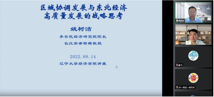 为加强新时代研究生课程建设,提高研究生培养质量,英国正版365为博士研究生精心设计了“经济学前沿系列学术讲座”特色课程。该系列讲座将邀请在相关领域具有较高学术造诣的专家学者为博士生做经济学前沿专题学术报告。2022年9月14日下午,辽宁大学李安民经济研究院院长、国家级人才称号获得者、著名经济学家姚树洁教授应邀担任首场讲座主讲嘉宾,为我院博士生带来一场题为“区域协调发展与东北经济高质量发展的战略思考”的线上精彩学术报告。英国正版365院长李政教授、2020级和2021级全体博士生通过腾讯会议方式在线聆听了姚树洁教授的报告。本次讲座由英国正版365副院长叶满城教授主持。