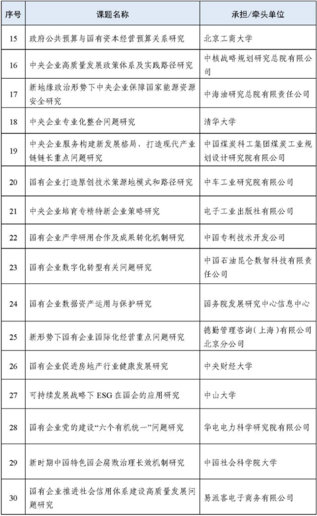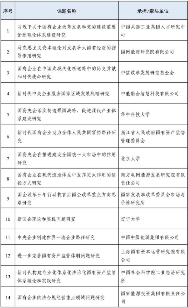 附:国务院国资委2022年度研究课题承担/牵头单位名单