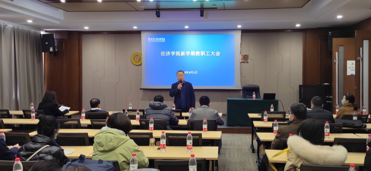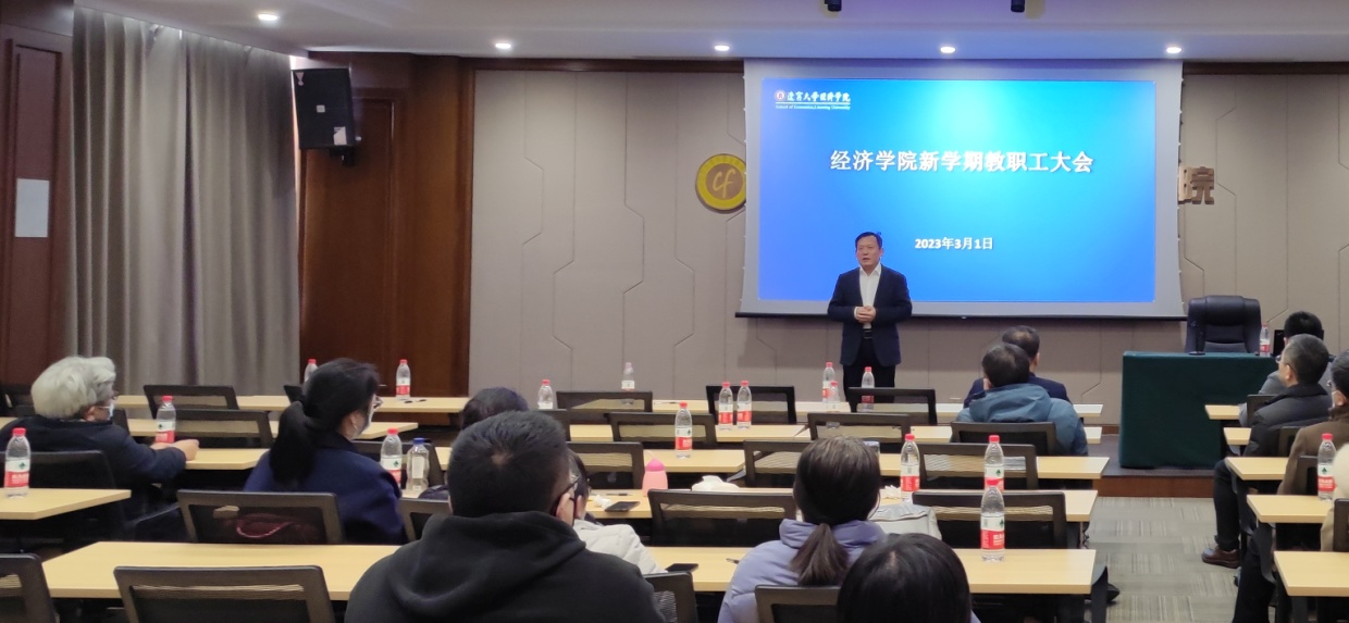 李政院长首先传达了潘一山书记、余淼杰校长在辽宁大学2023年度工作大讨论和新学期中层干部大会上的讲话精神,并以“团结一致向前看,只争朝夕保一流”为题做了发言。李政院长表示,当前学院发展、学科建设正处在特殊时期,关键时刻,全院上下要齐心协力,鼓足干劲,确保完成各项既定任务和目标。他介绍,潘一山书记在全校中层干部大会上明确表示今年是全面贯彻落实党的二十大精神的开局之年,全校上下要把学习宣传贯彻党的二十大精神作为首要政治任务,这是我们今年工作的“主线”。同时,要把“双一流”建设作为政治任务高质量推进。因此,学院全体教师要聚焦学校中心任务,与学校有关精神和发展方向保持高度一致。大家要熟悉和了解学科评价指标体系,围绕重点指标,对标对表积极开展工作,汲取经验,有所行动,有所表现,有所突破。学院也会努力搭建平台,为教师们舒心工作创造良好氛围。他鼓励教师们通过积极申报项目、发表高水平学术论文,在有影响力的学术会议上发言等途径展露风采,发出辽大的声音。最后,李政院长引用了余淼杰校长在新学期中层干部大会上的讲话:以时不我待的精神高效率工作,一天当作两天用,两步并作一步跑,人人尽责,人人努力,以新气象、新担当、新作为,切实推动学校高质量发展,为打赢新时代东北振兴、辽宁振兴的“辽沈战役”做出辽大贡献。他号召教师们为学院发展建言献策,以主人翁的精神为学院发展建设贡献自己的智慧和力量。