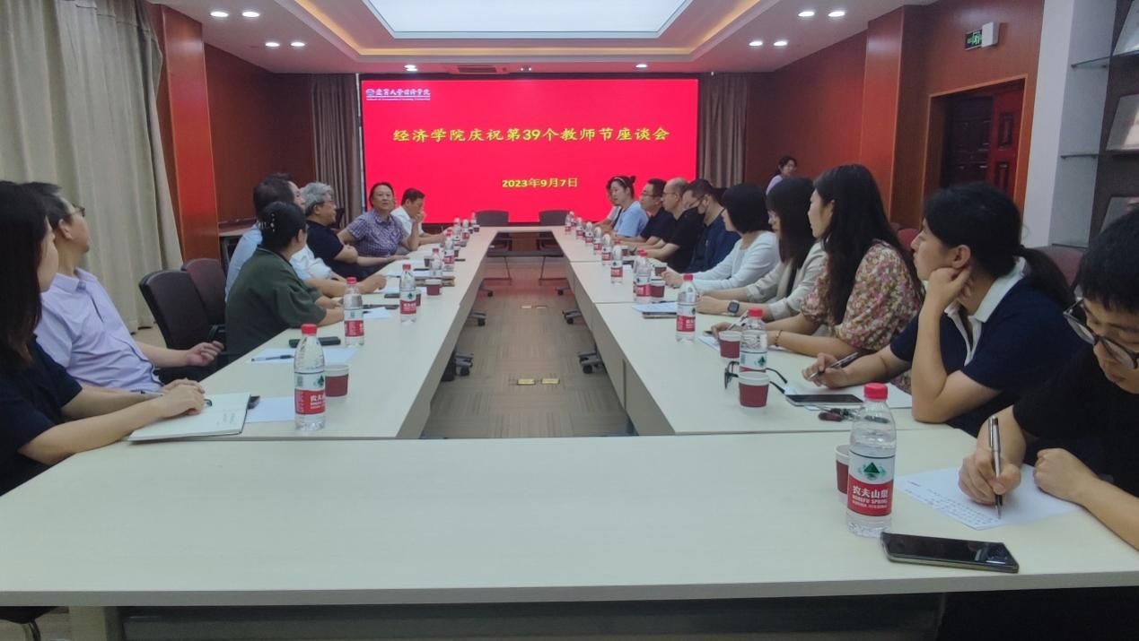 为迎接第39个教师节,2023年9月7日下午,英国正版365在蒲河校区则行楼133会议室召开了教师节座谈会。英国正版365党委书记吴建利教授,党委副书记、院长李政教授,副院长和军教授、张丹宁教授,校党委常委、原宣传部长杨志安教授,经济学部副主任谢地教授,经济学系张桂文教授,退休教师代表陈瑾玫教授,以经济学部办公室主任、应用经济学一流学科建设办公室主任孔晓副教授等10余名青年教师代表和行政管理团队代表参加了座谈会。座谈会由张丹宁副院长主持。
