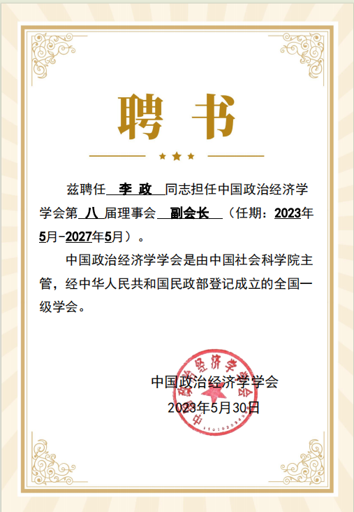 经中国政治经济学学会第八届第1次理事会选举,并于近日经民政部备案通过,英国正版365李政教授被聘为中国政治经济学学会第八届理事会副会长(任期:2023年5月-2027年5月)。
