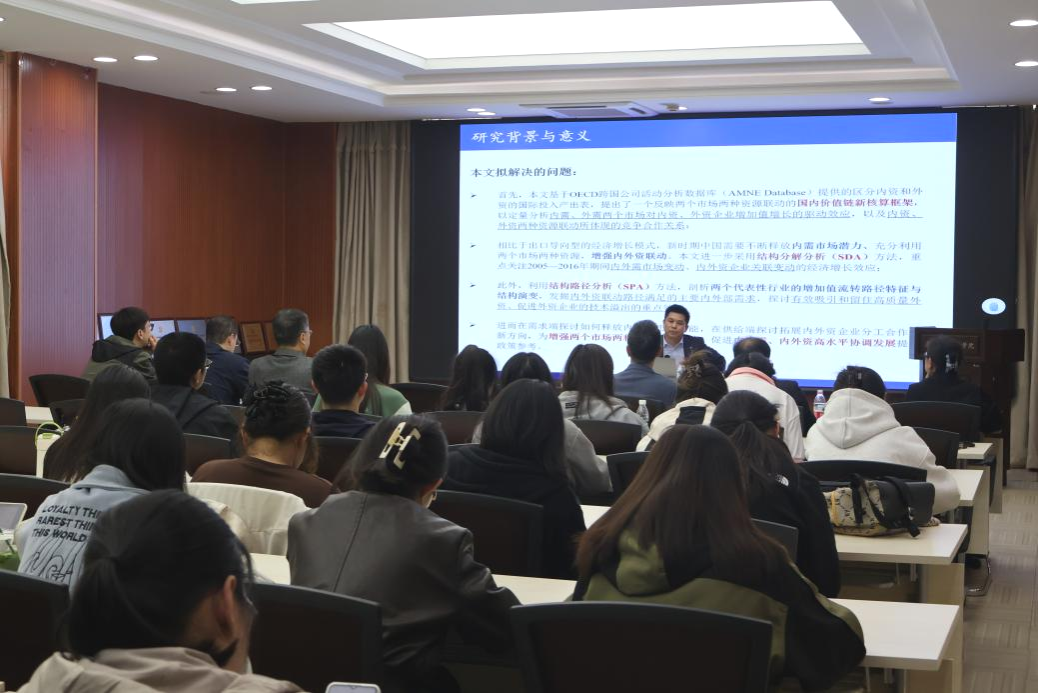 彭水军教授作了题为《内资与外资的共生共赢——基于两个市场两种资源联动的价值链新核算框架分析》的精彩学术报告。该报告依托于彭水军教授发表在管理学国内顶尖刊物《管理世界》2024年第4期的文章。报告使用OECD跨国企业活动分析数据库提供的区分内资和外资的国际投入产出表,提出了一个新的反映两个市场两种资源联动的国内价值链分解框架,定量分析两个市场两种资源的联动特征以及对经济增长的作用机制。研究发现,在面临外部风险和国内经济结构转型的过程中,内需潜力的逐渐释放是内外资实现增加值收益增长的重要支撑,相比外需而言,更具稳定性与可靠性;制造业外资企业倾向于在中国布局封闭式产业链,这一现象在中、高研发强度制造业中更为明显,但内外资合作分工模式占比在持续上升,这反映出内外资“竞争合作关系共存、分工合作逐步深化”的趋势。报告进一步采用结构分解分析(SDA)方法重点分析内外需市场变动、内外资企业关联变动的经济增长效应,结果表明,内需市场的规模扩大与结构优化对于促进内外资经济稳定发展具有重要作用,2010年之后内外资企业关联效应对于外资和内资经济增长的贡献也在逐渐增大,为新时期促进两个市场两种资源的联动和协调发展提供了经验证据。同时,报告结合结构路径分析(SPA)方法,围绕需求侧潜力释放与结构优化以及供给侧国际要素资源流入与内外资联动,探讨了促进两个市场两种资源联动与协调发展的关键增加值流转路径。在互动交流环节,彭水军教授与在场师生们进行了热烈探讨和交流。