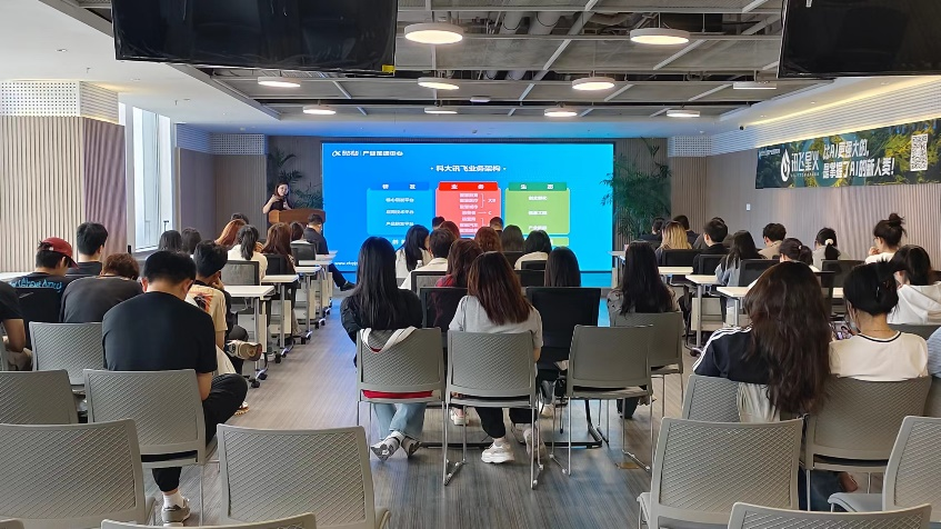 参观调研过程中,高丹总监详细为师生介绍了科大讯飞凭借国家新一代人工智能开放创新平台的强大开发能力和丰富的开发者资源,构建了线上线下相融合的创新服务平台。该平台为众多开发者和创业团队提供了全方位的线下赋能,包括技术、市场、投资、品牌、管理以及政策六大核心赋能服务,从而有力地推动了创新型中小微企业实现高质量发展。同时做了题为“革新未来的AI大模型时代——大学生创新创业交流”的培训报告,受到同学们的热烈欢迎。座谈会上,李玥总监为师生介绍了公司在教育领域的投资与最新发展,结合自身经历给学生们的未来发展规划提出议,并回答了多位同学的问题,现场积极互动,气氛活跃。