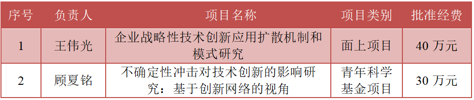 近日,国家自然科学基金委员会公布了《关于2024年国家自然科学基金集中接收申请项目评审结果的通告》。我院王伟光教授申请的《企业战略性技术创新应用扩散机制和模式研究》项目获批2024年度国家自然科学基金面上项目,顾夏铭副教授申请的《不确定性冲击对技术创新的影响研究:基于创新网络的视角》项目获批2024年度国家自然科学基金青年科学基金项目。项目具体情况如下: