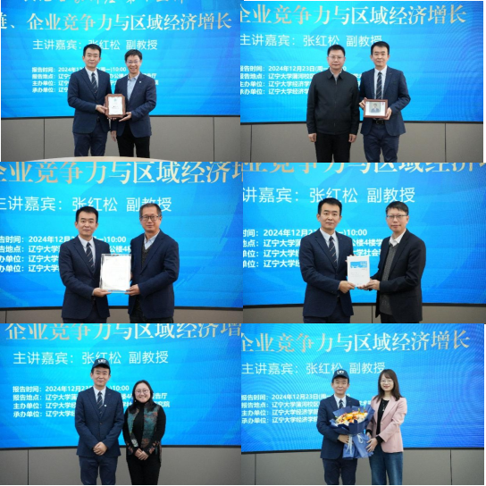 余淼杰校长向与会师生介绍了张红松副教授在中国经济和宏观经济学领域的卓越成就。张红松是北京大学经济学硕士,师从林毅夫教授,美国宾夕法尼亚州立大学经济学博士,香港大学经管学院经济学(终身)副教授,现任香港大学中国经济研究所副所长和香港大学经管学院深圳研究院经济战略与发展研究中心副主任。他的研究领域包括实证产业组织、国际贸易和应用经济学,尤其关注企业在生产力、供应商网络和需求方面的竞争力如何影响企业在国内和国际市场上的表现。张红松副教授的研究成果发表在多个顶级期刊上,包括《兰德经济学杂志》(RAND Journal of Economics)、《经济学期刊》(Economic Journal)、《经济学与统计评论》(Review of Economics and Statistics)、《 国 际 经 济 评 论 》( International Economic Review)、《发展经济学杂志》(Journal of Development Economics)和《欧洲经济评论》(European Economic Review)等。自 2020 年以来,张红松副教授还担任《国际产业组织杂志》(International Journal of Industrial Organization)的副主编,并自 2018 年起成为中国贸易研究会的执行委员会成员。他的学术成就和对中国经济研究的贡献,必将为学校的学科建设、人才培养和知识传承带来深远的影响。余淼杰校长感谢张红松副教授受聘为辽宁大学讲座教授,并指出他将为学校的发展作出重要贡献,推动理论创新和学术研究的进一步深化。