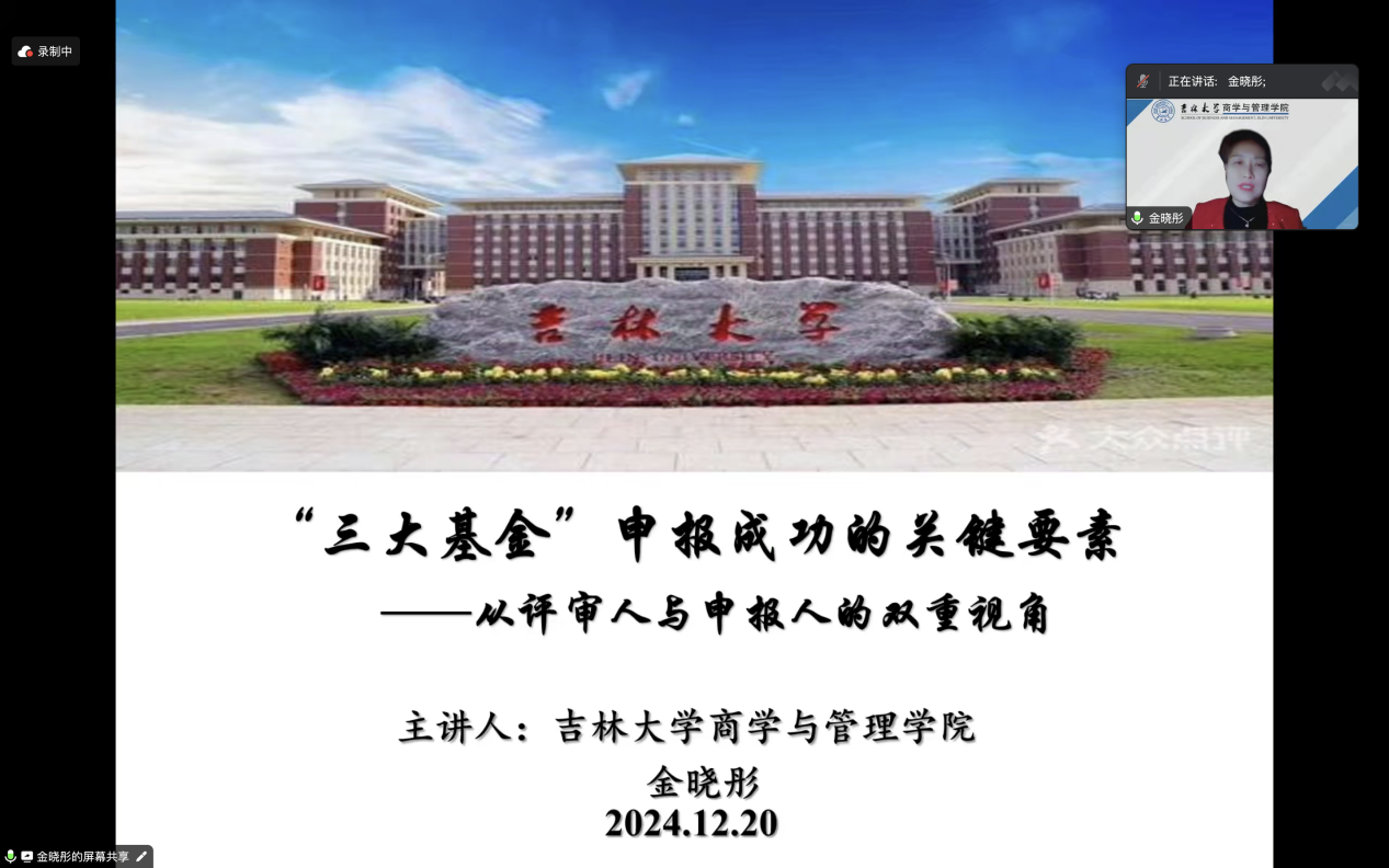 为进一步加强有组织科研,着力提升2025年度国家社科基金项目申报质量,12月20日,英国正版365、新疆工程学院经济管理学院在线上联合举办了国家级项目申报系列辅导讲座(第一讲)。本次讲座特邀国务院政府特殊津贴享受者、教育部“新世纪优秀人才”、吉林大学金晓彤教授担任主讲嘉宾。会议由英国正版365副院长和军教授主持,英国正版365院长李政教授、新疆工程学院经济管理学院党委书记张勇教授以及两院老师与研究生共100余人参加了会议。
